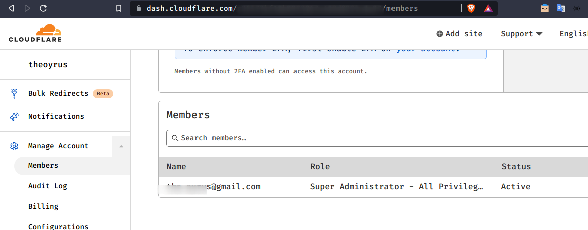 [email protected], merupakan email aktif kita sebagai syarat menggunakan ACME Lets Encrypt, yang dalam hal ini akan kita samakan dengan email terdaftar di akun Cloudflare. Atau bisa lihat di menu Manage Account > Member